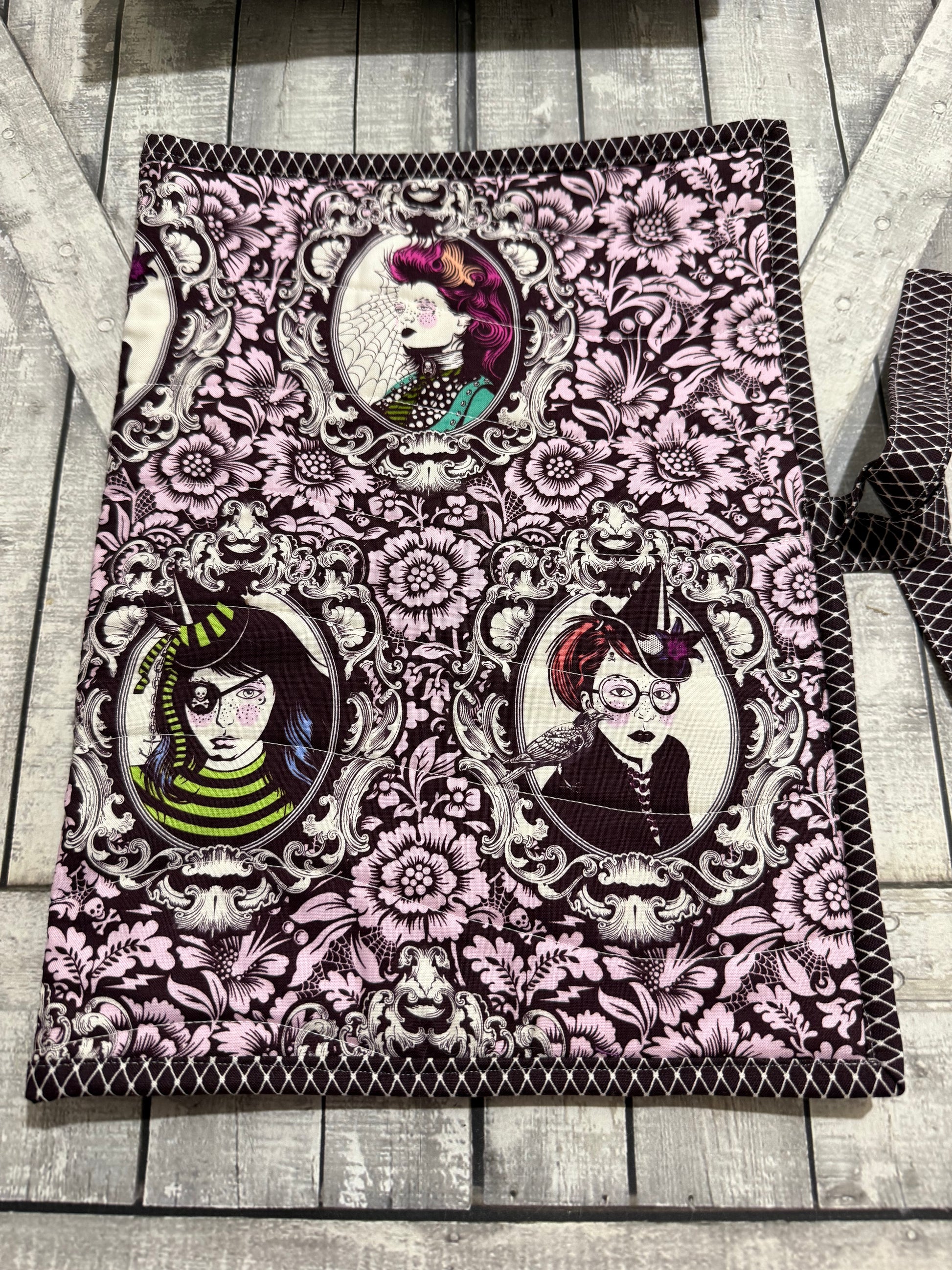 Crafted from Tula Pink's Nightshade Deja Vu fabric, these bags weave the tale of three magical sisters. Each design features their faces, their trusty familiars, or the mysterious potions brewed in their spider-filled gardens.
