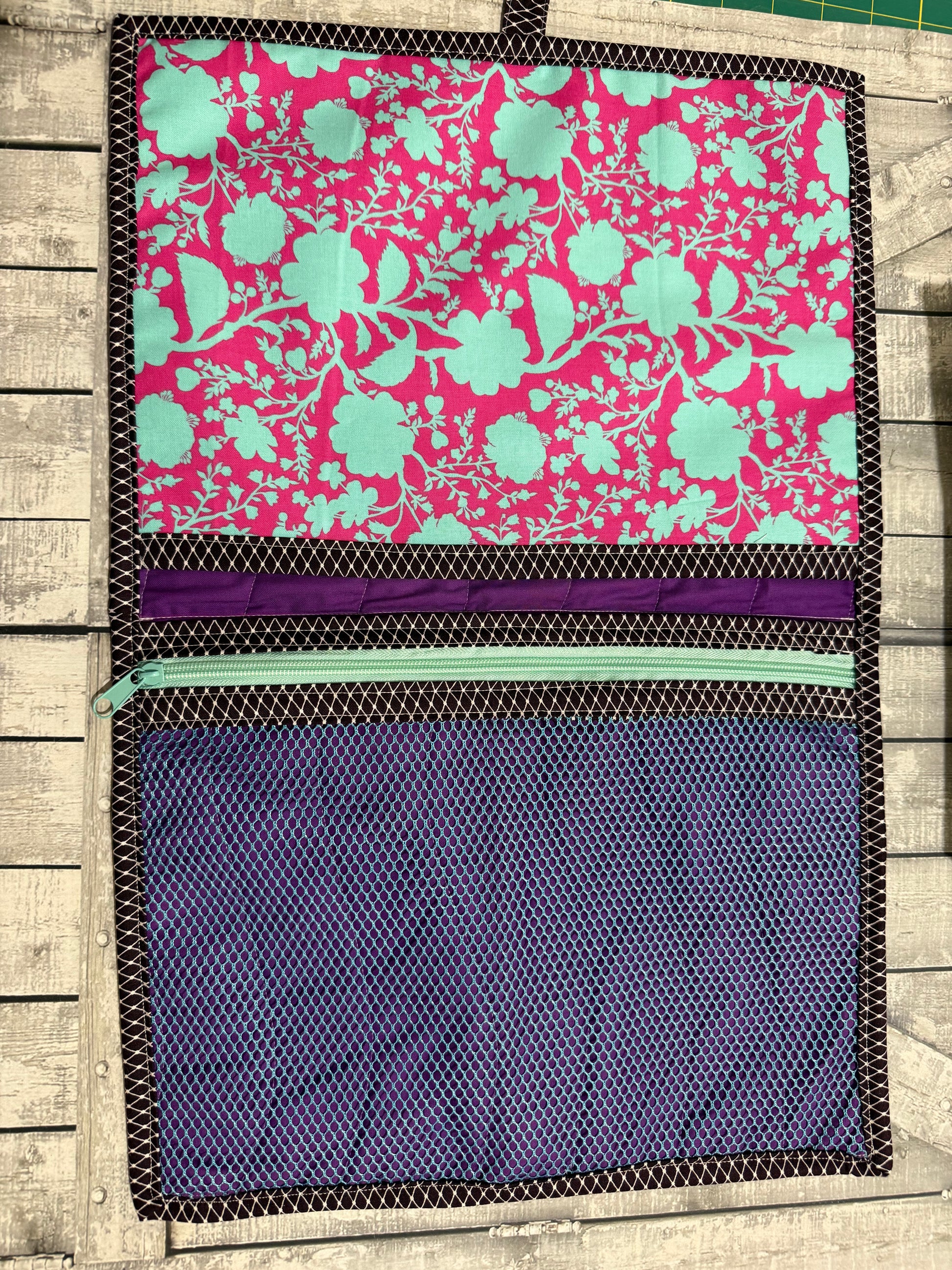 The Large Cross Stitch bag measures approximately 11” x 14” closed, 22” x 14” open. The Small Cross Stitch bag measures approximately 9.5” x 9.5” closed, 19” x 9.5 open. Inside on one side there is a mesh pocket with a zipper to hold floss, scissors, etc. The other side has a wide pocket that will easily fit a paper pattern and your fabric.