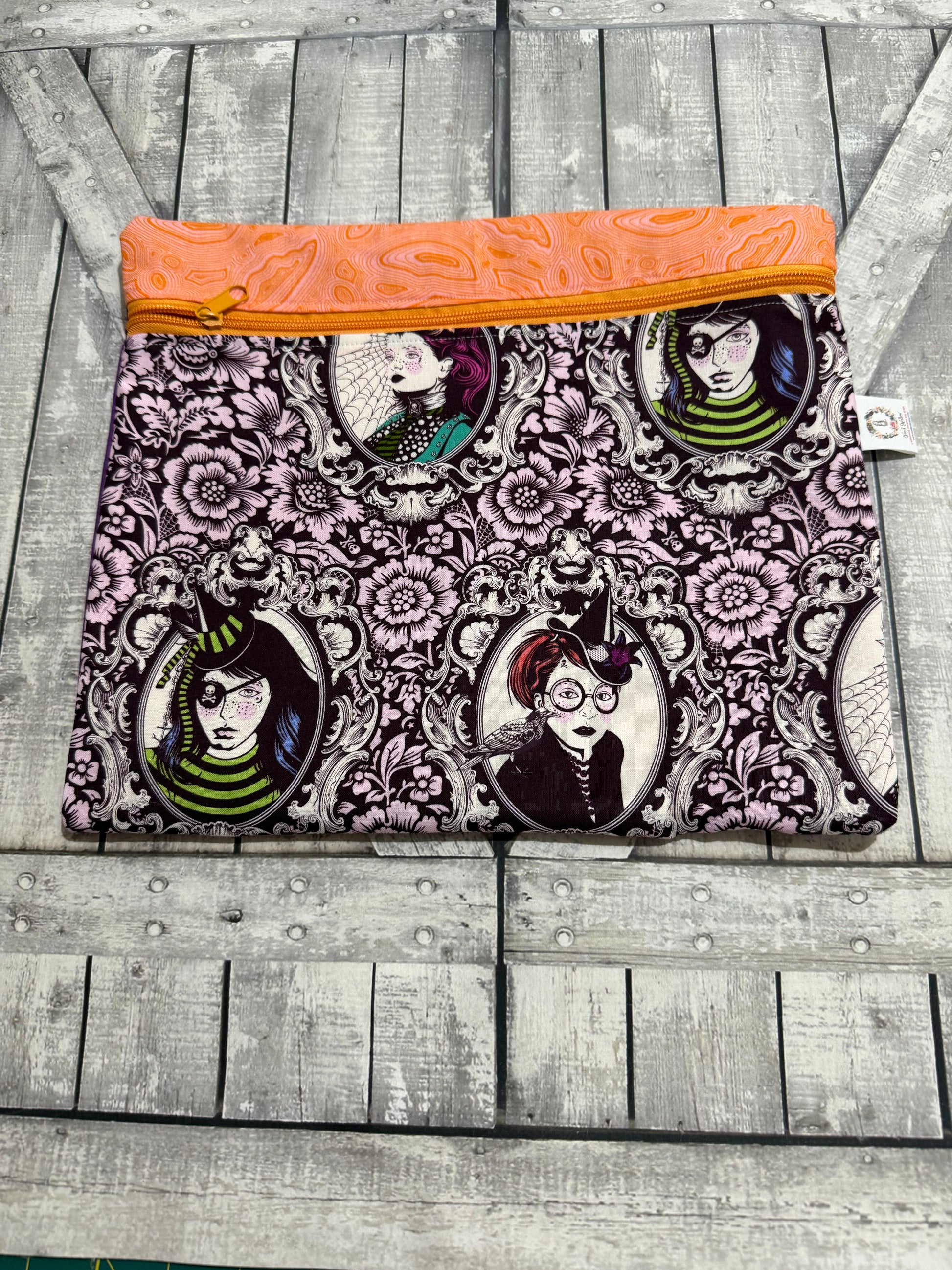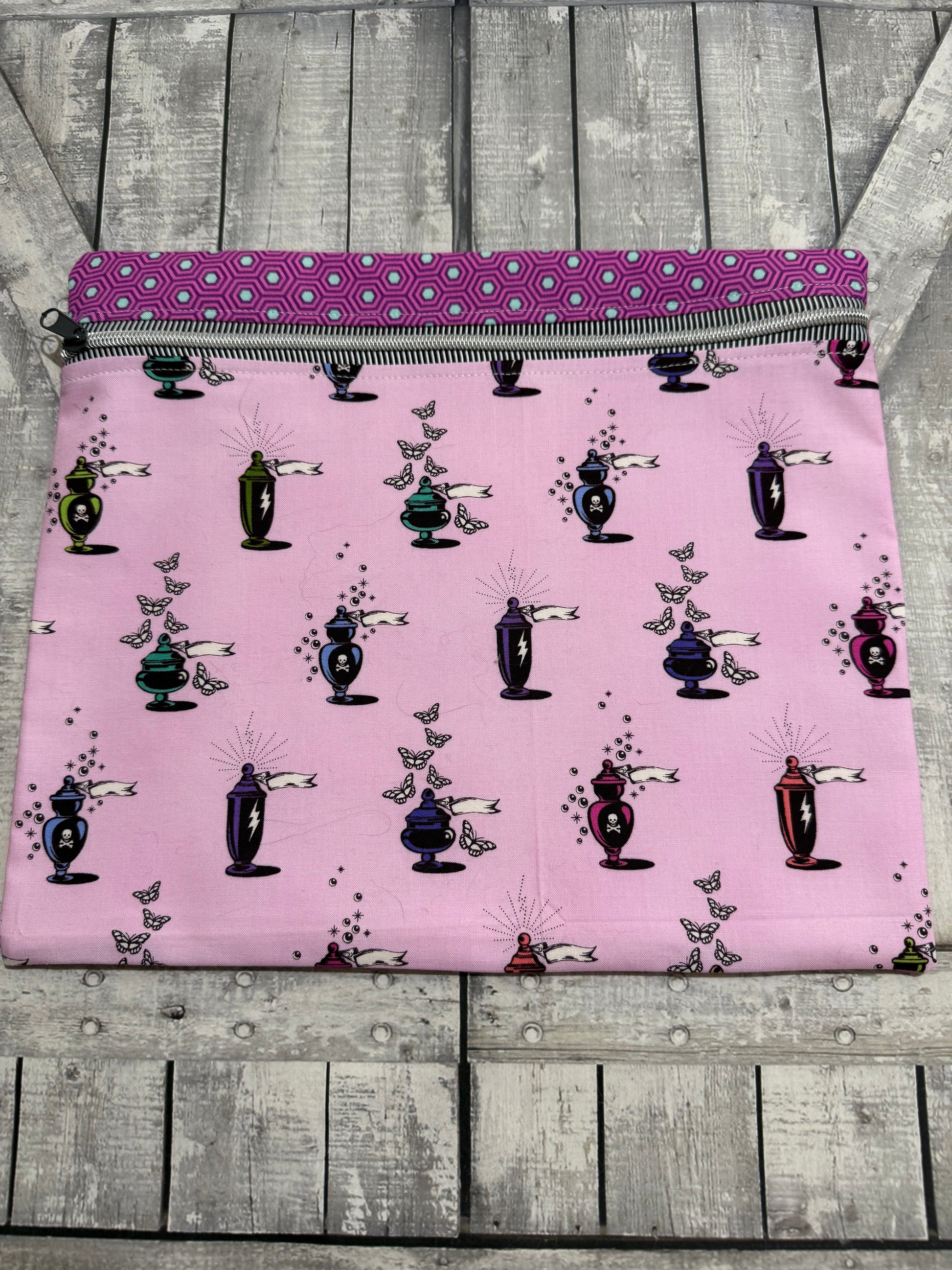 Crafted from Tula Pink's Nightshade Deja Vu fabric, these bags weave the tale of three magical sisters. Each design features their faces, their trusty familiars, or the mysterious potions brewed in their spider-filled gardens.